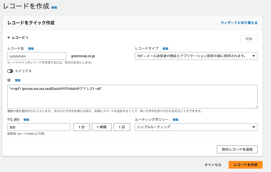 レコード名にサンプルとして「mail」値にはElastic IPのPublicIPアドレスを入力してください。